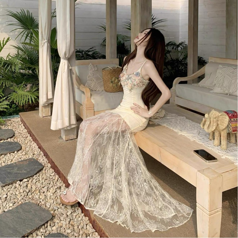 New French-style heavy-duty 3D floral lace fishtail maxi dress