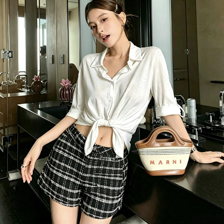 High waisted woolen plaid shorts