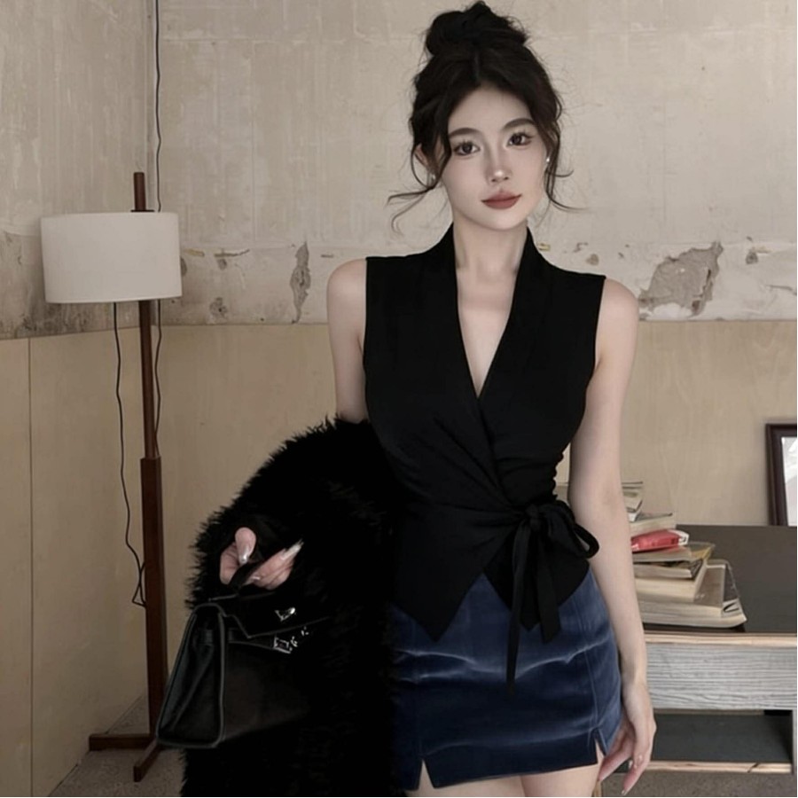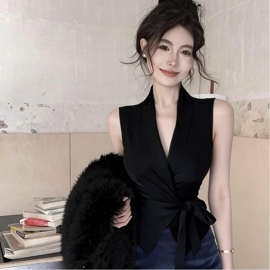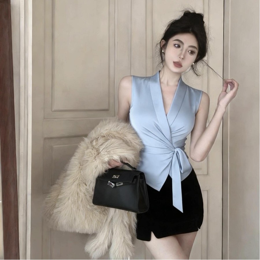 Satin tie V-neck waist shirt