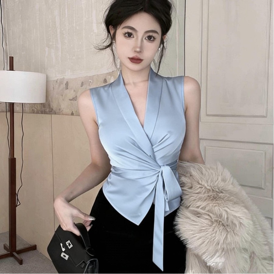 -43% Satin tie V-neck waist shirt