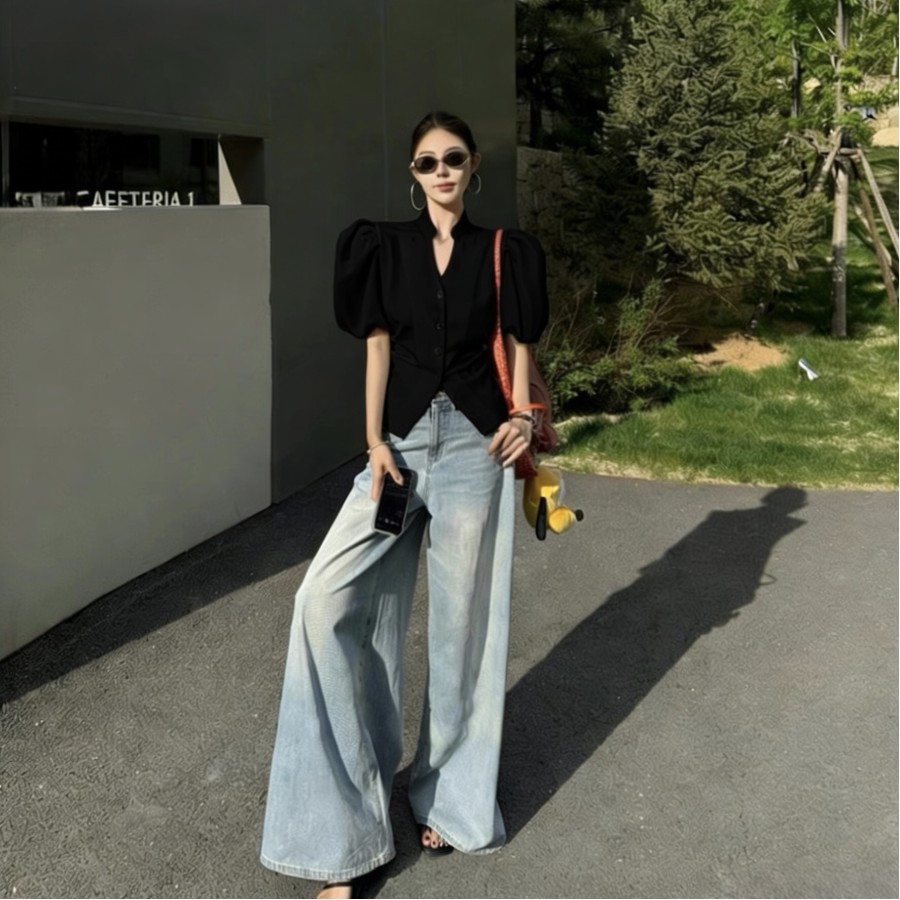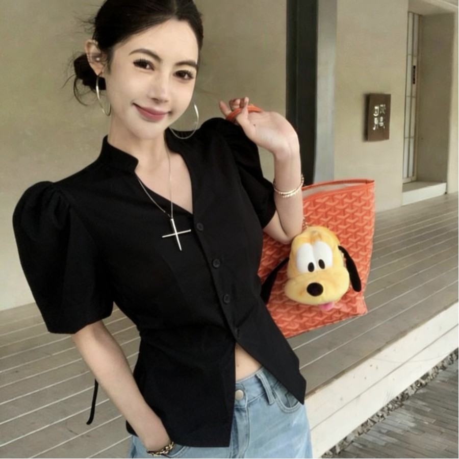 V-neck puff sleeve waist-baring shirt