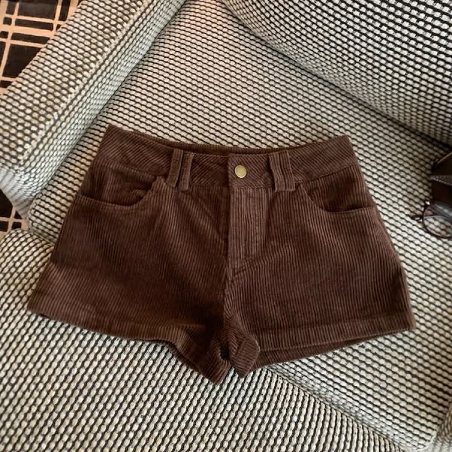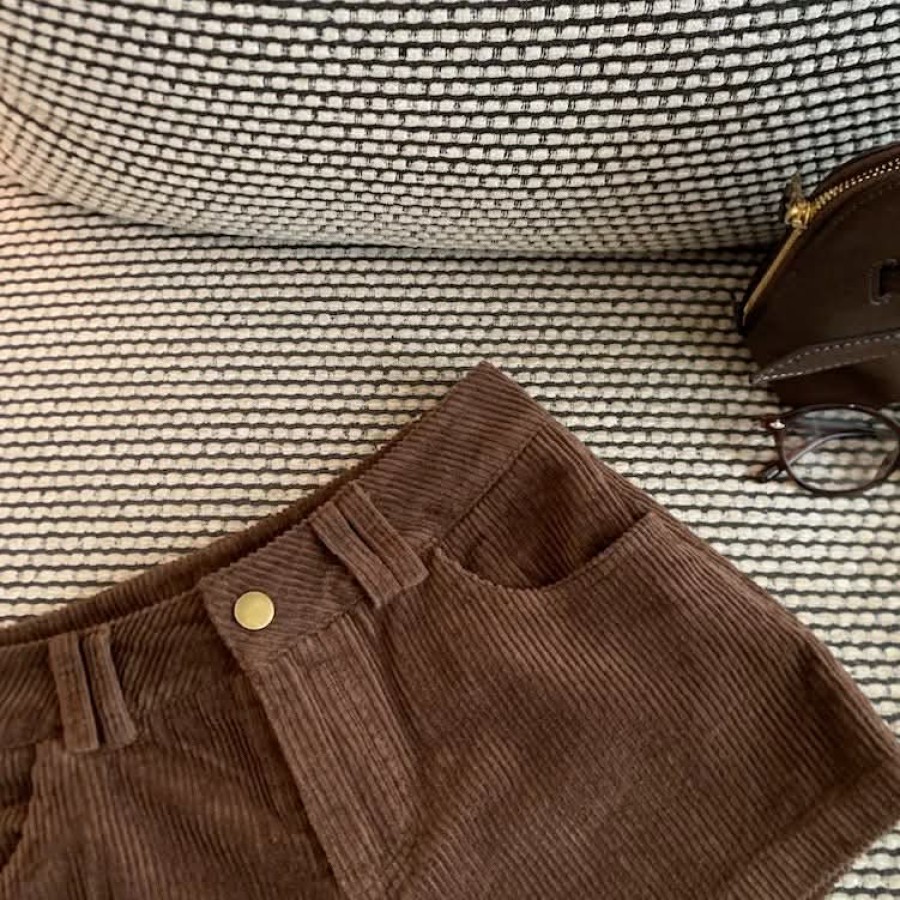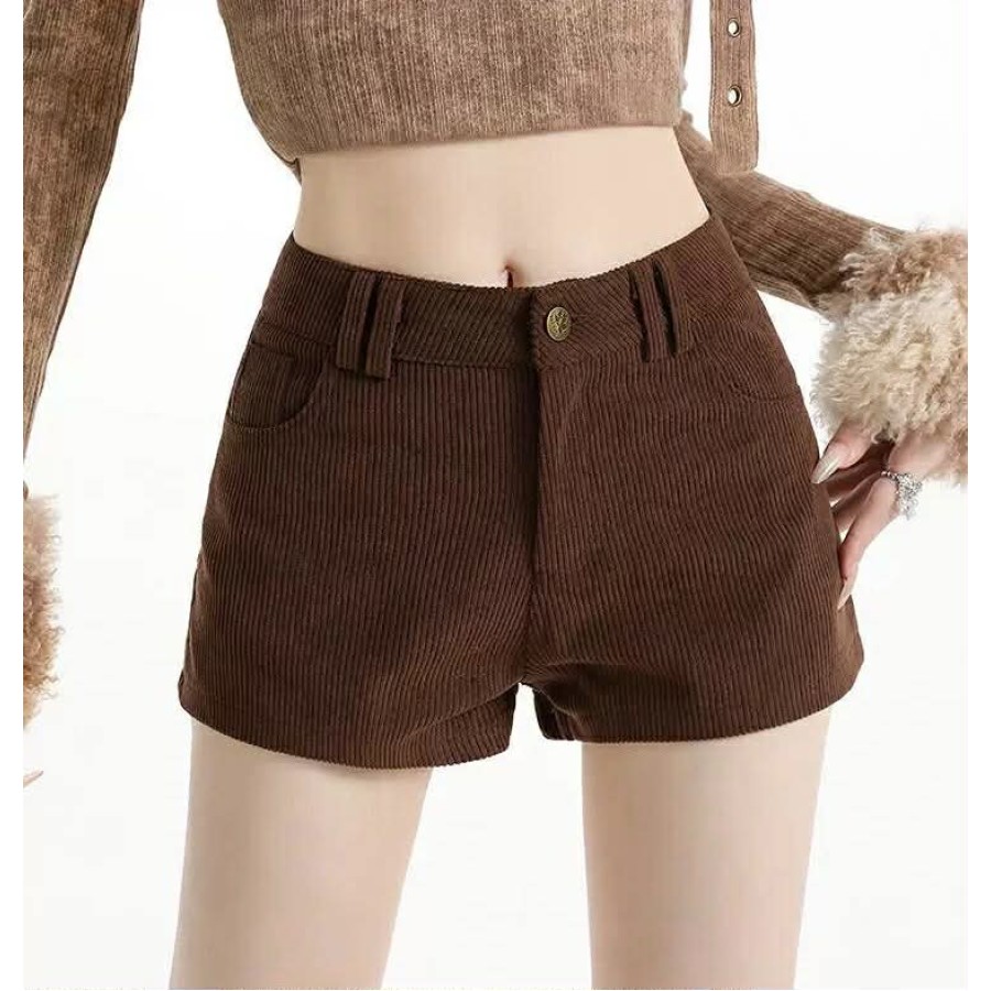 深褐色薄款灯芯绒低腰短裤