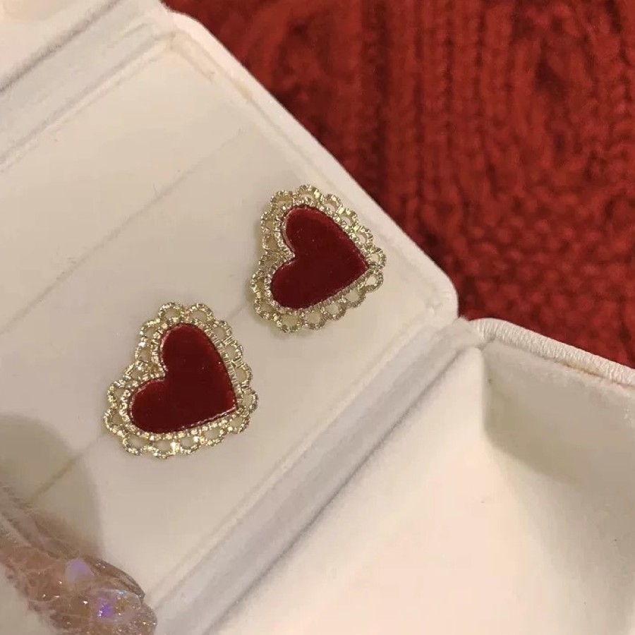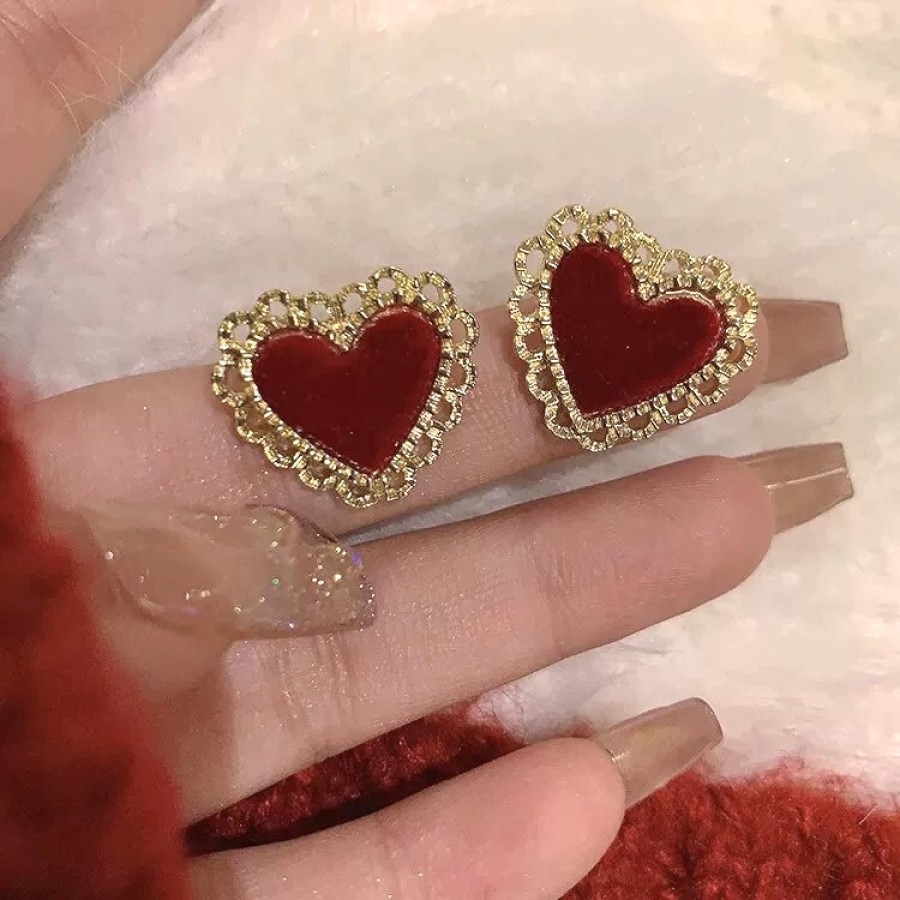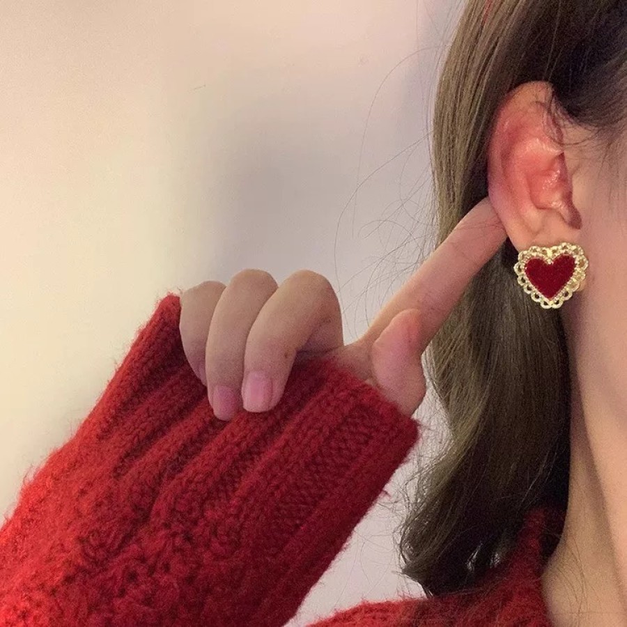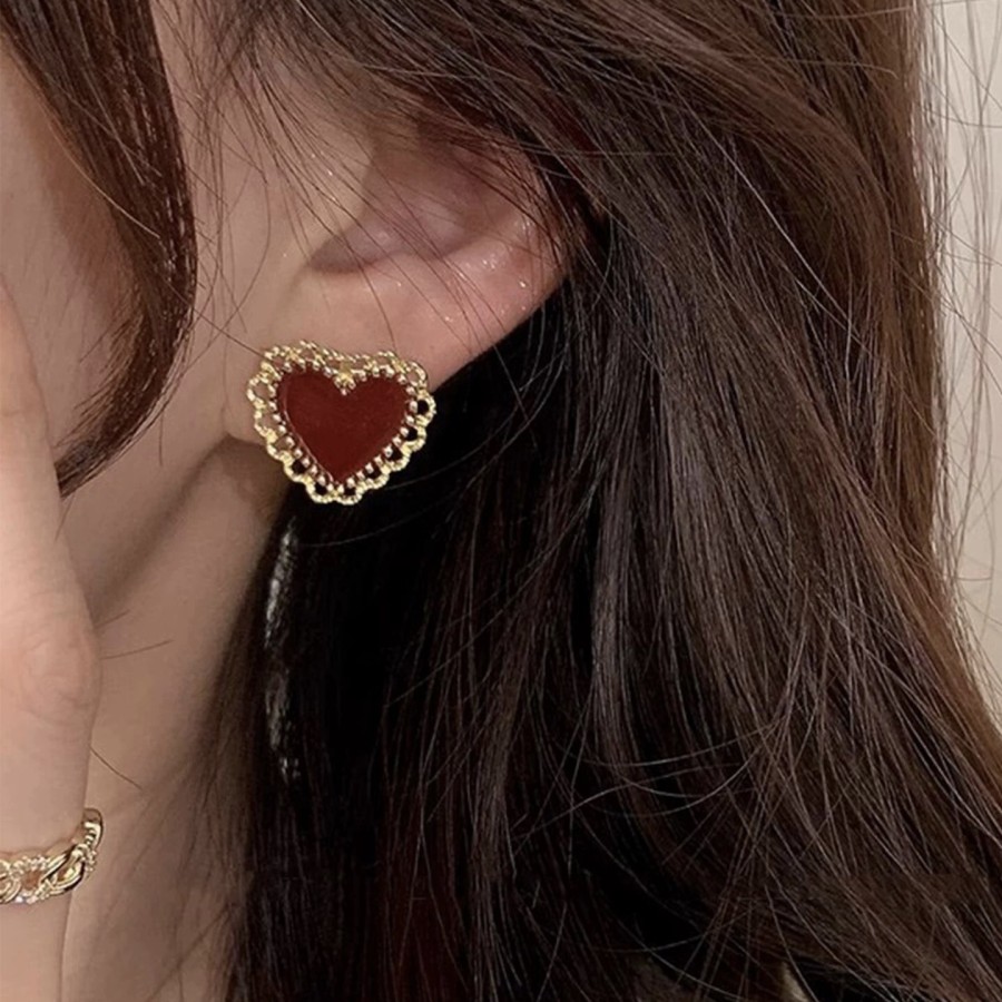 酒红色爱心设计耳环